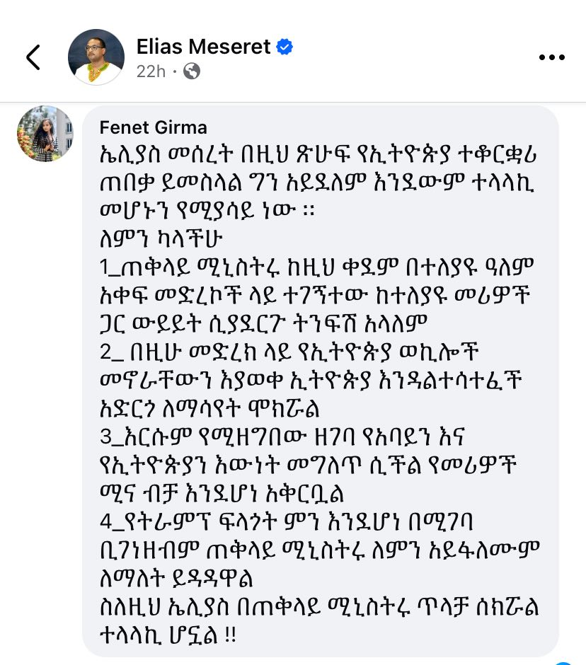 በዓለም የኢኮኖሚ ፎረም የኢትዮጵያ ተሳትፎ እና እውነታን በዚሁ ከላይ ባሰፈርኩት መነሻ ለማየት ያነሳሳኝም በተለይ ራሱን የ “Fact Checkers” ፊት አውራሪው አድርጎ የሾመው አቶ ኤሊያስ መሰረት የሞነጫጨረው የሽንፈቱ ኑዛዜ ነው።