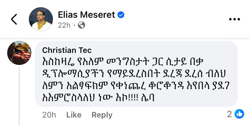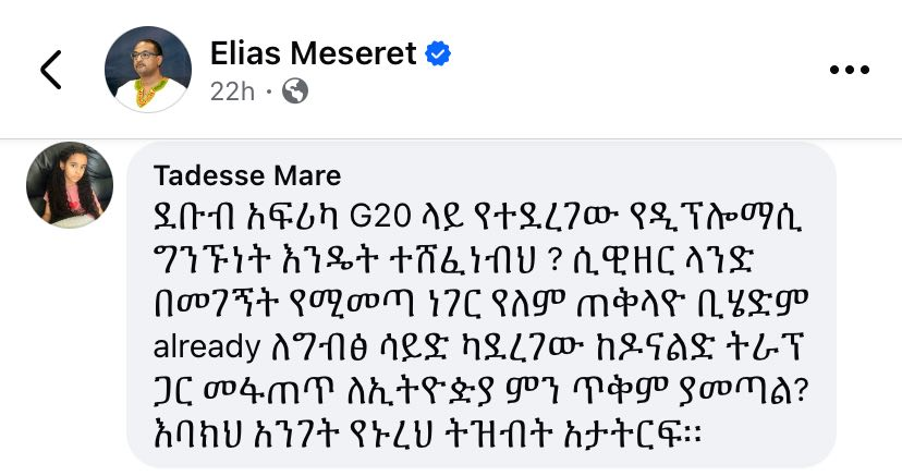 አንተም ሆንክ መሰል ባልደረቦችህ ኢትዮጵያ ደቡብ አፍሪካ በተካሄደው የጂ20 ስብሰባ ላይ ኢትዮጵያ በጠቅላይ ሚኒስትር አብይ አማካይነት የስብሰባው መሪ ተዋኛን እስክትመስል ድረስ ገና ስትወጣ ያላችሁት ምንም ነገር የለም። በብራዚል በተካሄደው ታላቅ የዓለማችን ስብሰባ ኮፕ32ን እንድታዘጋጅ ኢትዮጵያ ስትመረጥና የውጭ ሚዲያዎች በስበር ዜና ሲያቀርቡት ለመሆኑ የት ነበርክ? የዲፕሎማሲ ኩስመና ነበር? ከሃምሳ ሺህ በላይ እንግዳ የሚተራመስበት፣ የኢትዮጵያን የቱሪዝም አብዮት አንድ እርምጃ ከፍ የሚያደርግ፣ የኢትዮጵያ ግሪን ሌጋሲ ውጤት ስለሆነው ስለዚህ ጉባኤ ተንፍሰሃል?