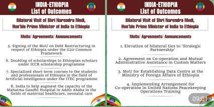 ታሪካዊ የተባለውን ጉብኝት የጀመሩት ጠቅላይ ሚኒስትር ናሬንድራ ሞዲ ህንድ እና ኢትዮጵያ በትምህርት፣ በፈጠራ፣ በጤና አጠባበቅ እና በኢኮኖሚ ማገገሚያ ላይ ያተኮሩ ስምንት ዋና ዋና ውጤቶች ላይ መስማማታቸውን በይፋዊ የትዊተር(X) ገፃቸው አስፍረዋል። ኢትዮጵያ እና ህንድ ታሪካዊ ወዳጅነታቸውን ወደ ስትራቴጂካዊ ትብብር ለማሸጋገር መወሰናቸው ትክክለኛ እርምጃ ነው ሲሉ ጠቅላይ ሚኒስትር ዐቢይ አሕመድ አስታውቀዋል።
